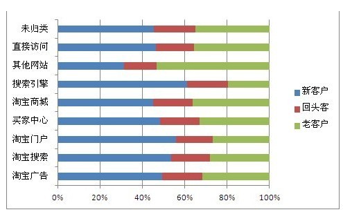 從上述圖表中,我們可以看到賣(mài)家一周內(nèi)的新客戶、回頭客、老客戶都是從不同的來(lái)源進(jìn)入網(wǎng)店的?;蛟S因搜索排名、口碑、品牌、商品展示等因素影響了消費(fèi)者的首次購(gòu)買(mǎi)行為。細(xì)心的朋友會(huì)發(fā)現(xiàn),在上表中,回頭客、老客戶是店鋪流量的主力軍,但他們的來(lái)源又各不一樣,從其他網(wǎng)站、商城、直接訪問(wèn)、買(mǎi)家中心來(lái)的老顧客占得較多,而且質(zhì)量也比較高。